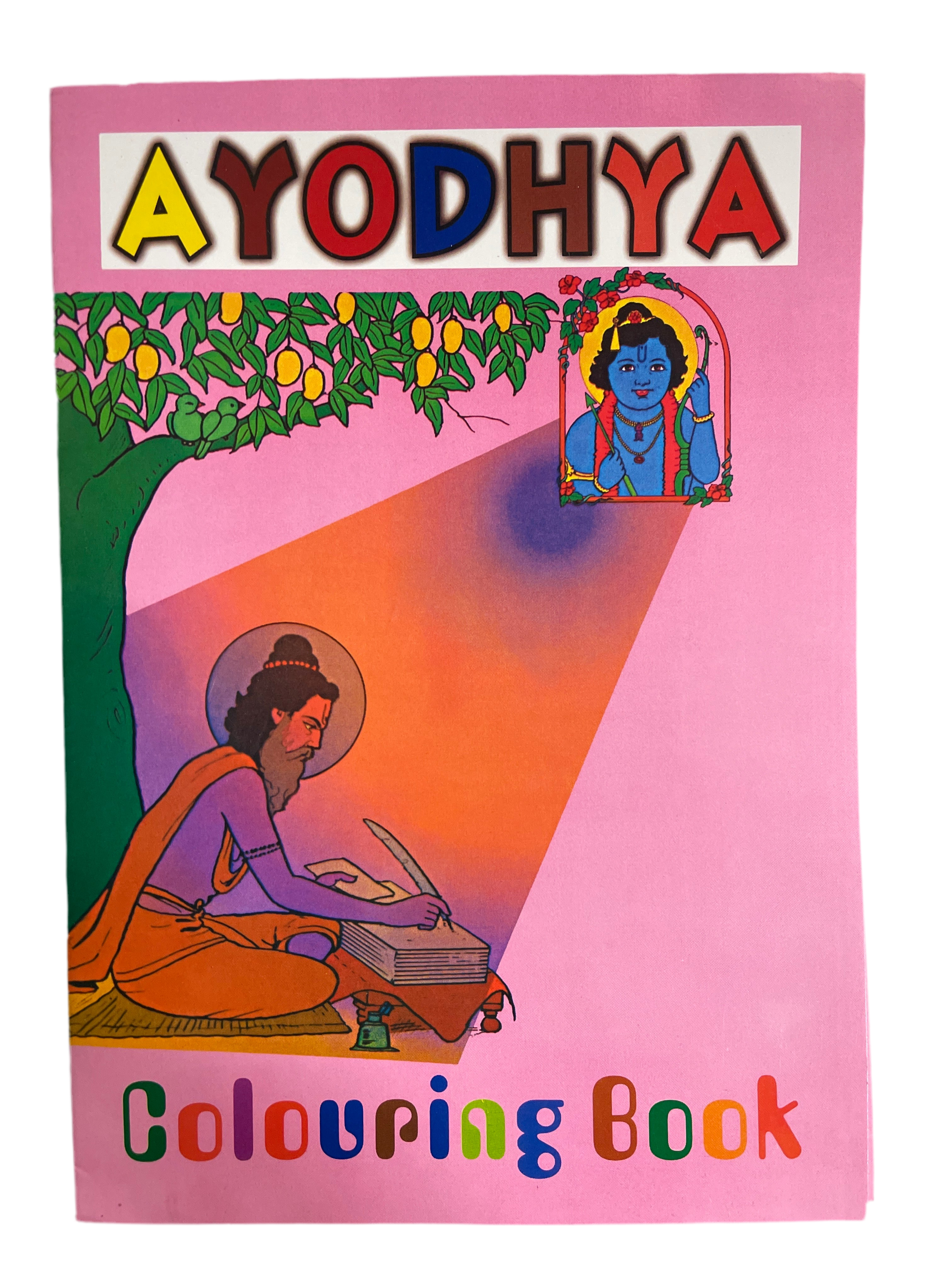 The story of Lord Ramacandra. 16 full page black and white drawings for colouring. Each page has two or three lines of text describing the image.