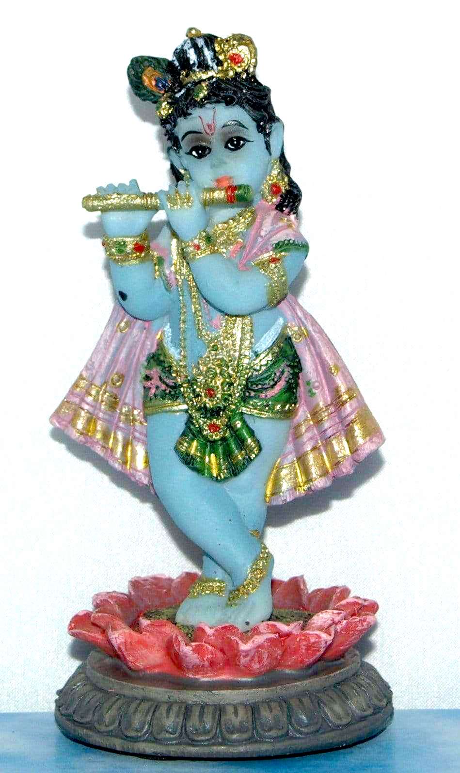 A Beautiful hand painted poly-resin figure of Lord Krishna playing His Flute in the heart of a lotus flower.