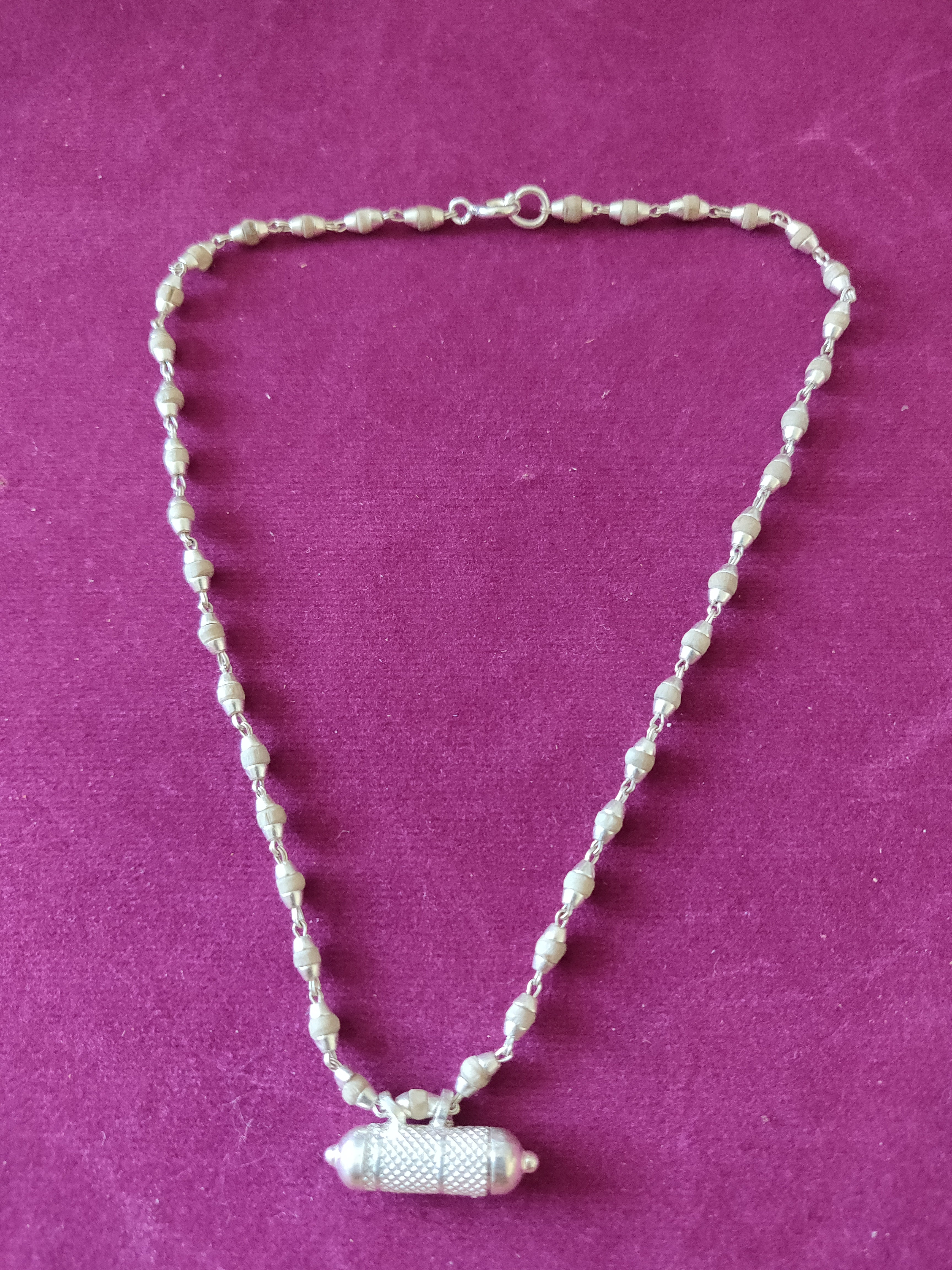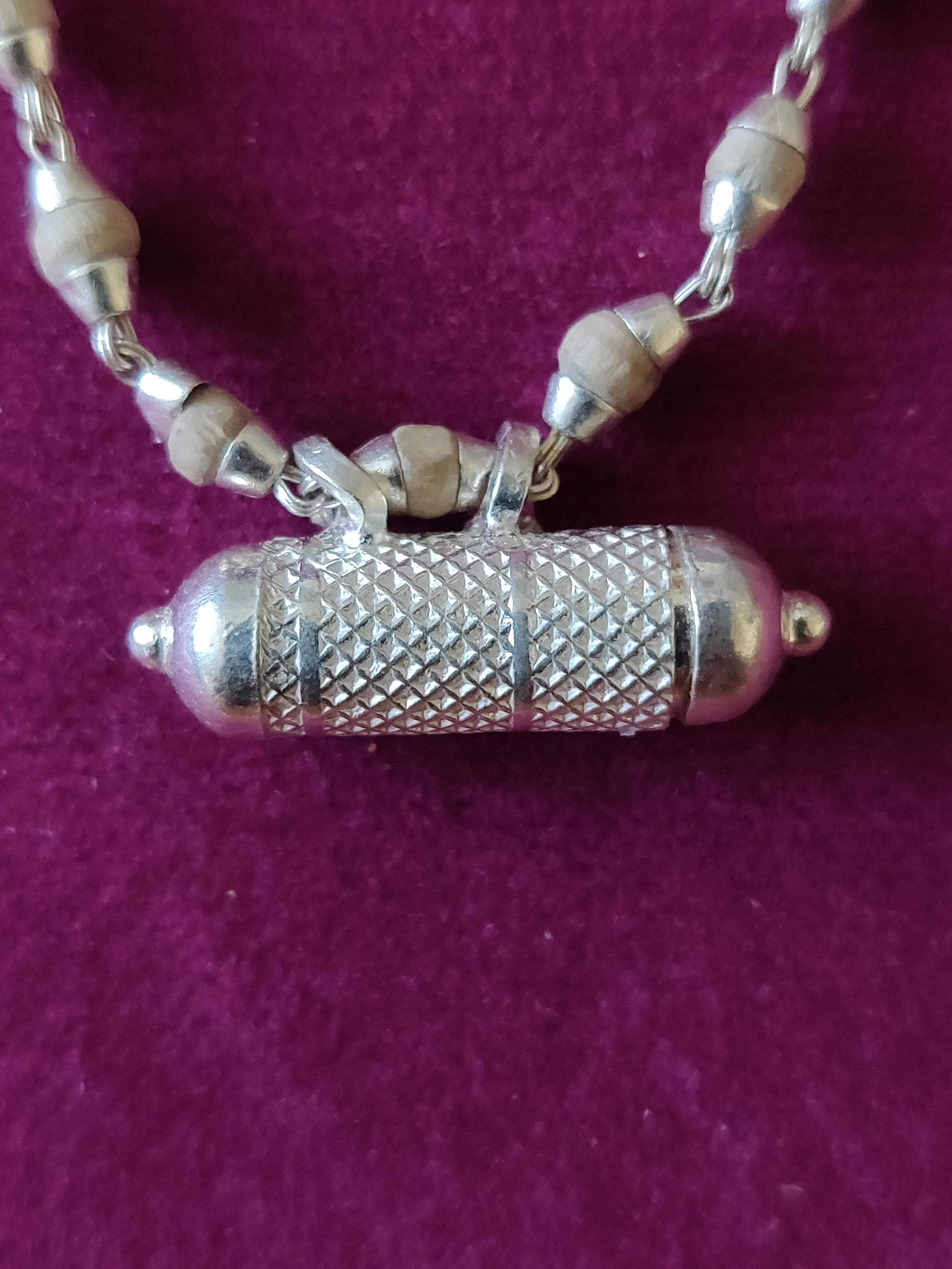 Pure Silver Tulasi Neck beads(Natural/Black Tulasi beads) with a Narshima kavach filled with Tulasi leaves, Vrindavan dust and Narshima yantra.  Size Approx :- 14" Full Length
